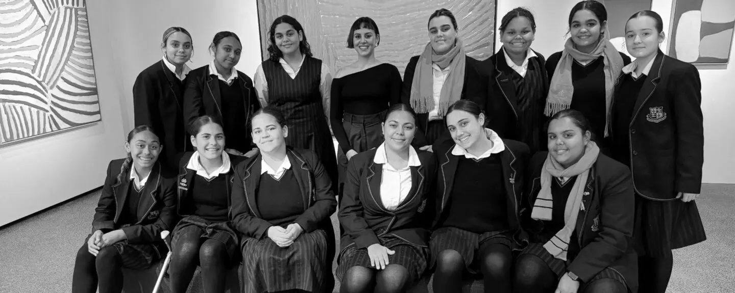 A highlight of the program was the students’ visit to Herczeg’s solo exhibition, Through Coloured Glass, at Curatorial+Co. in Woolloomooloo. Welcomed with a private preview and behind-the-scenes tour, the students engaged with gallery curator Claire Field and explored works by other Indigenous artists. The experience encouraged reflection on the importance of storytelling and voice in art, and how personal perspectives shape creative expression. Herczeg’s artist talk offered insight into her journey as a young Indigenous woman navigating identity and belonging, resonating deeply with the students.