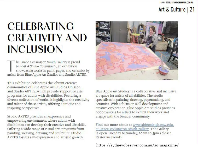 Blue Apple Art Studios specialise in a range of mediums, with art facilitators teaching techniques in ceramics, paper making, painting and drawing in a supportive and social environment. Blue Apple Studios is part of Unisson Disability, founded in 1924 by Lorna Hodgkinson.