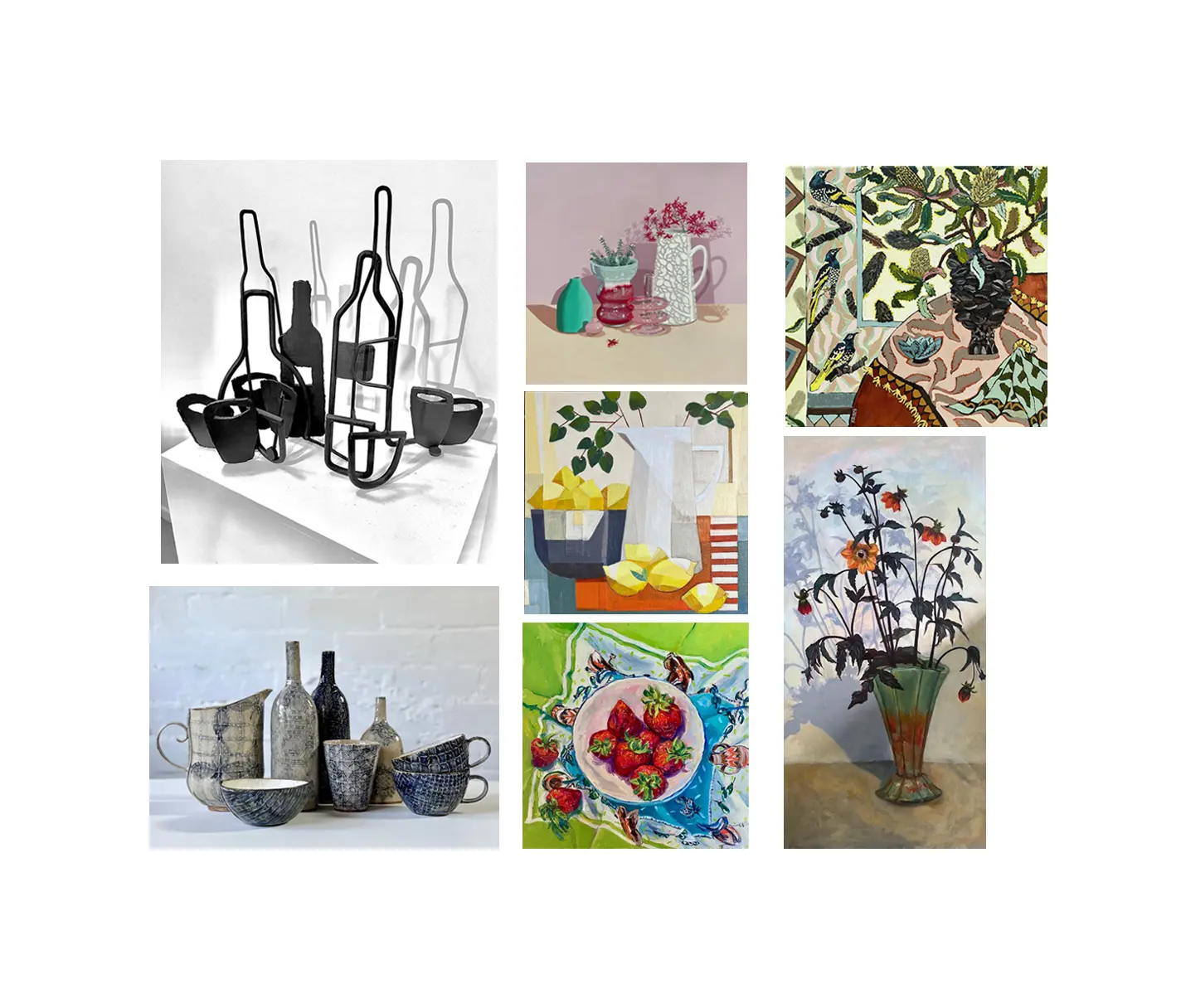 Kobie Bosch, Judy Denby, Bethany Macdonald Tucker, Paul Macdonald, Libby Moore, Suzie Rix, and Clare Unger share an exploration of contemporary still life practice. Through diverse approaches in painting, collage, ceramics, and sculpture, the group reflects on the enduring relevance of Still Life in today’s complex world.
