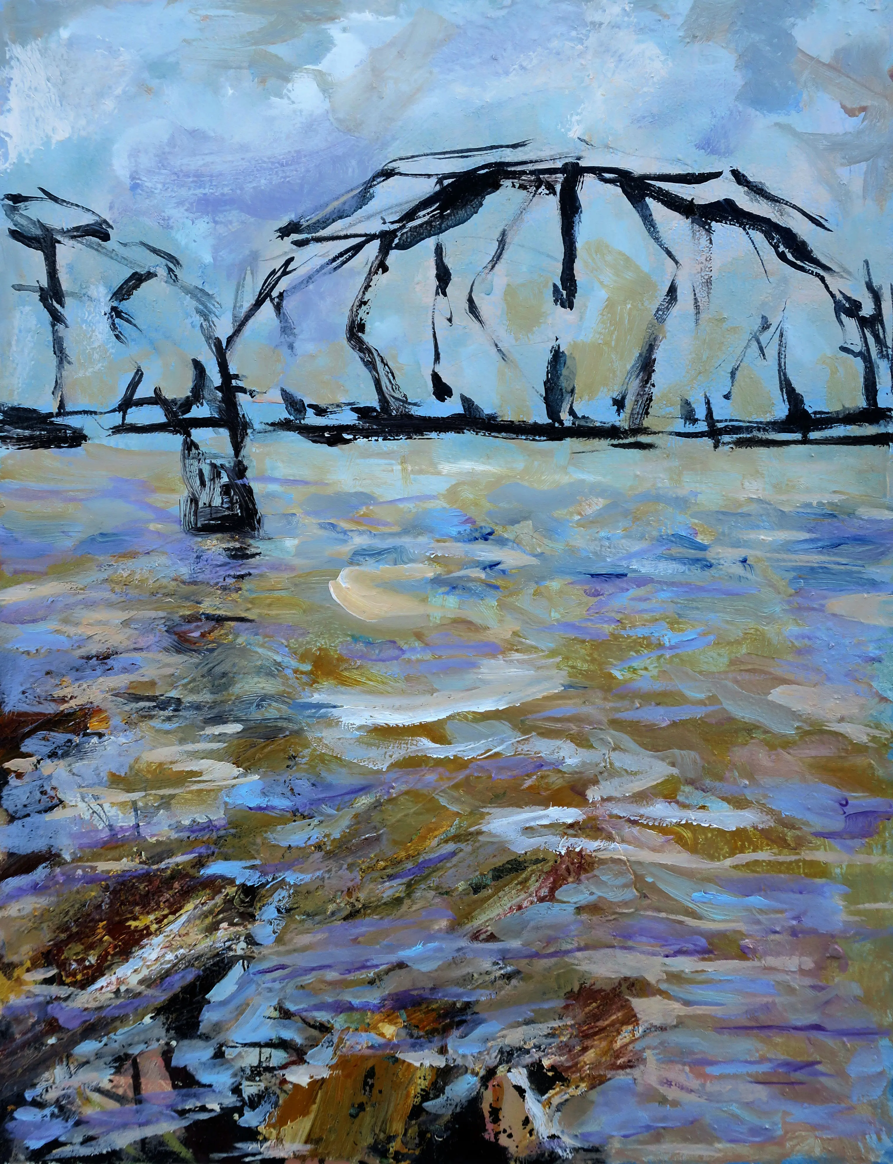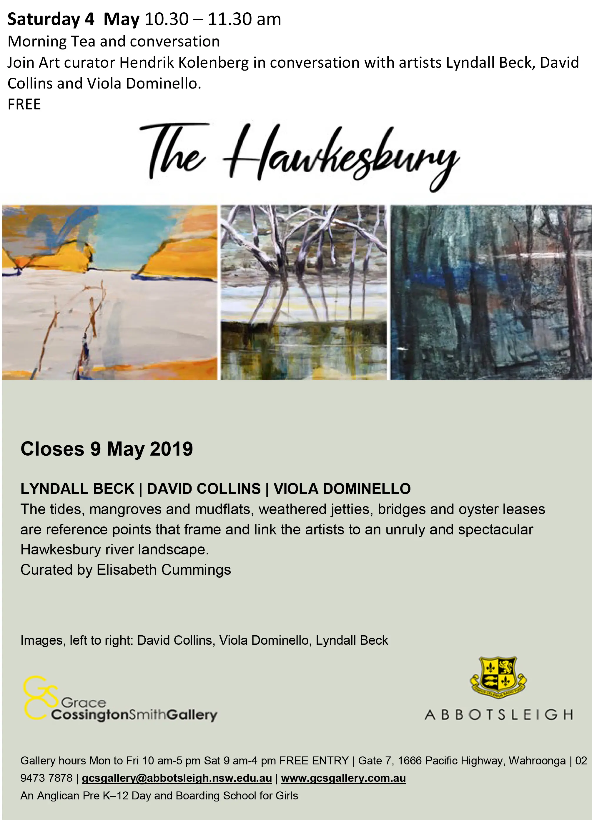 The Grace Cossington Smith Gallery is delighted to present an exhibition of works inspired by the Hawkesbury River. The artists, Lyndall Beck, David Collins and Viola Dominello show a reverence for the natural environment with its human interventions. The tides, mangroves and mudflats, weathered jetties, bridges and oyster leases are reference points that frame and link the artists to an unruly and spectacular coastal river landscape.