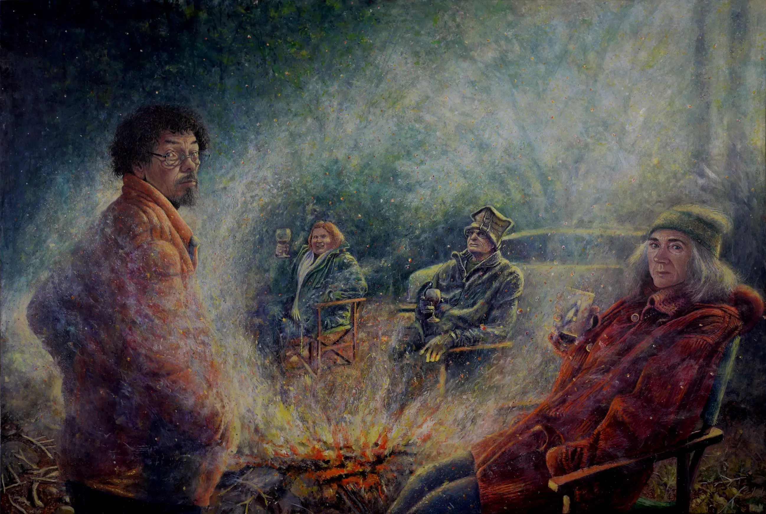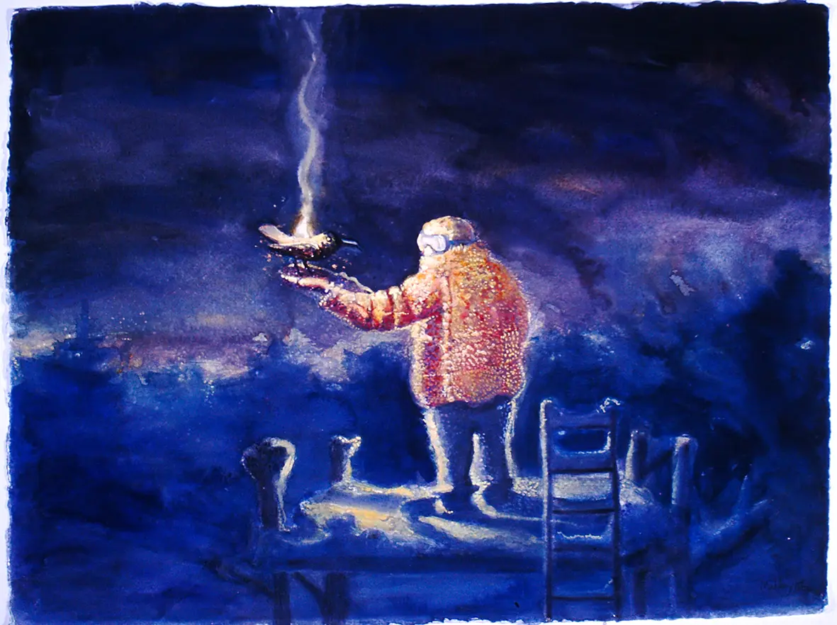 Vickers, states “Paul Miller is able to confront a notion of understanding that his affliction with Parkinson’s Disease is that swirl of smoke that threatens to envelop him in a bush picnic. Perhaps it is that light in the jar that is the illumination of the ‘blue angel’ who, after all, is the alter ego of the artist himself and he who has becomes the keeper of his own soul.”