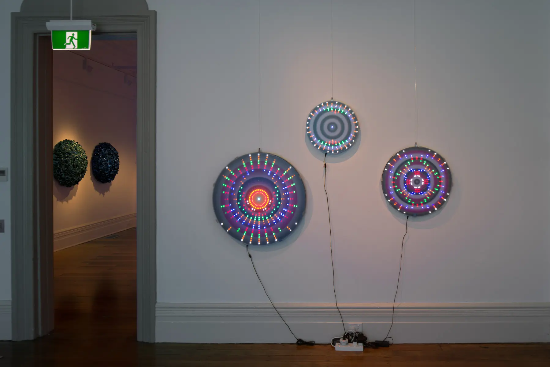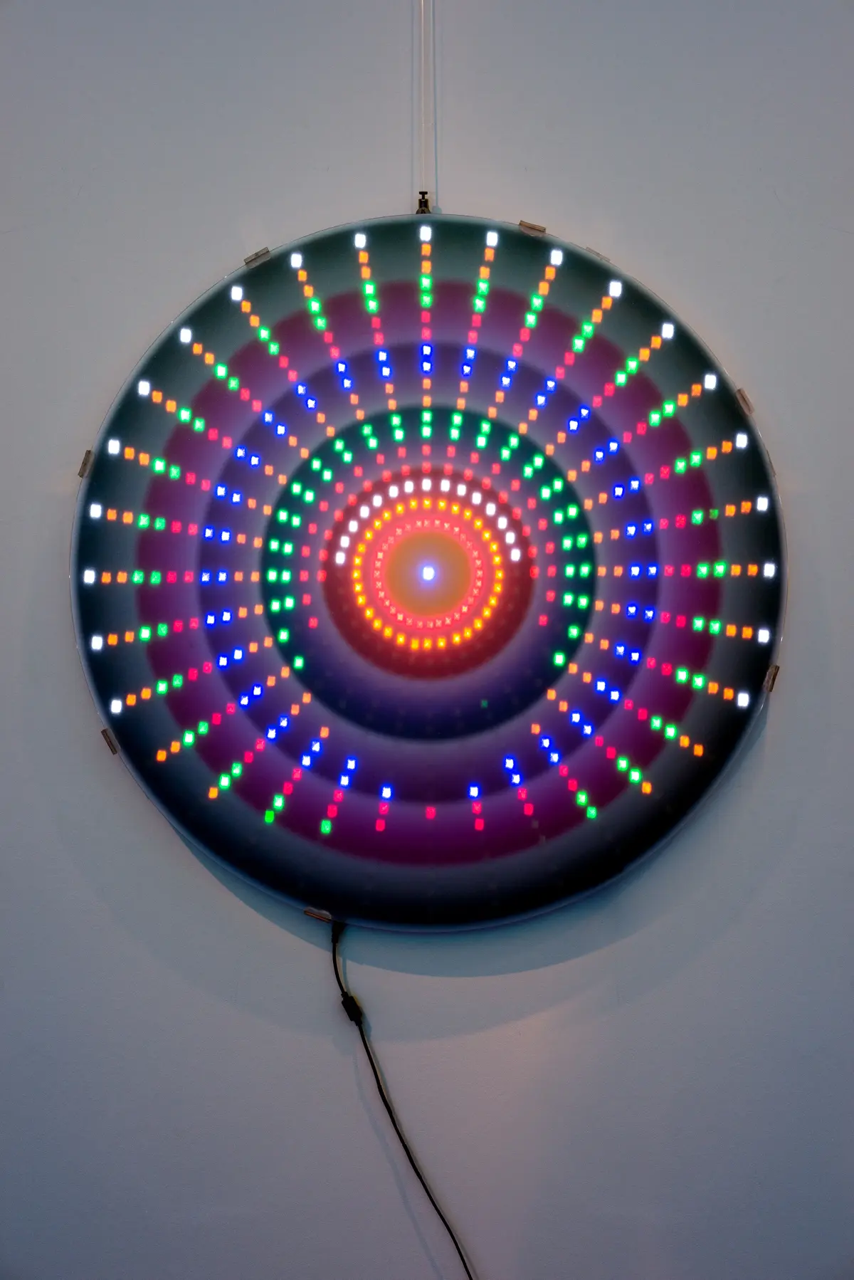 Mandala for the Lost, (three works) 2015. Giles Ryder is known for his subtle installations that combine industrial materials in conjunction with the influences of modern life and its embedded cultural associations. He uses the hard, reflective surfaces of advertising and consumerism in coordination with pared back, geometric paintings. In the LED Mandala series he has worked with readymade light structures from Cambodia, traditionally found behind statues of Buddha in Khmer temples. He has layered Thai street vernacular with a minimalist aesthetic. He currently lives and works in Thailand and Australia. Represented by MARS Gallery, Melbourne.