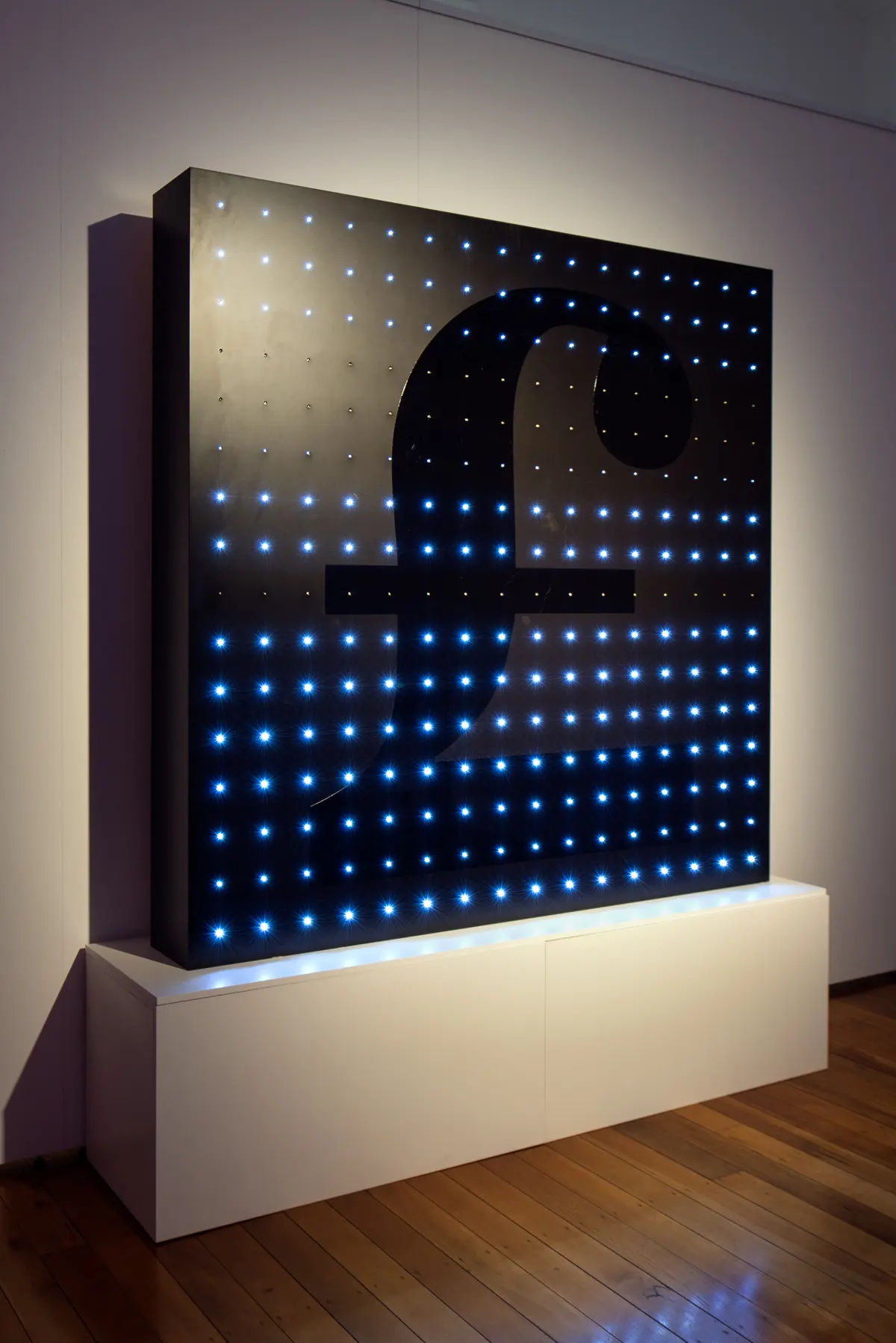 Dark Matter, 2009. Tom Loveday is an academic and conceptual artist producing oil and acrylic paintings, installations, and videos. Dark Matter draws visual ideas from the standard currency symbol, the pound as well as the stock market signs in which share values are presented to the “floor.” The work frames this imagery, of the world of money and investment, as “Dark Matter” a substance invisible to science and yet which has been mathematically theorized as making up most of the matter in the universe. Represented by Conny Dietzschold Gallery