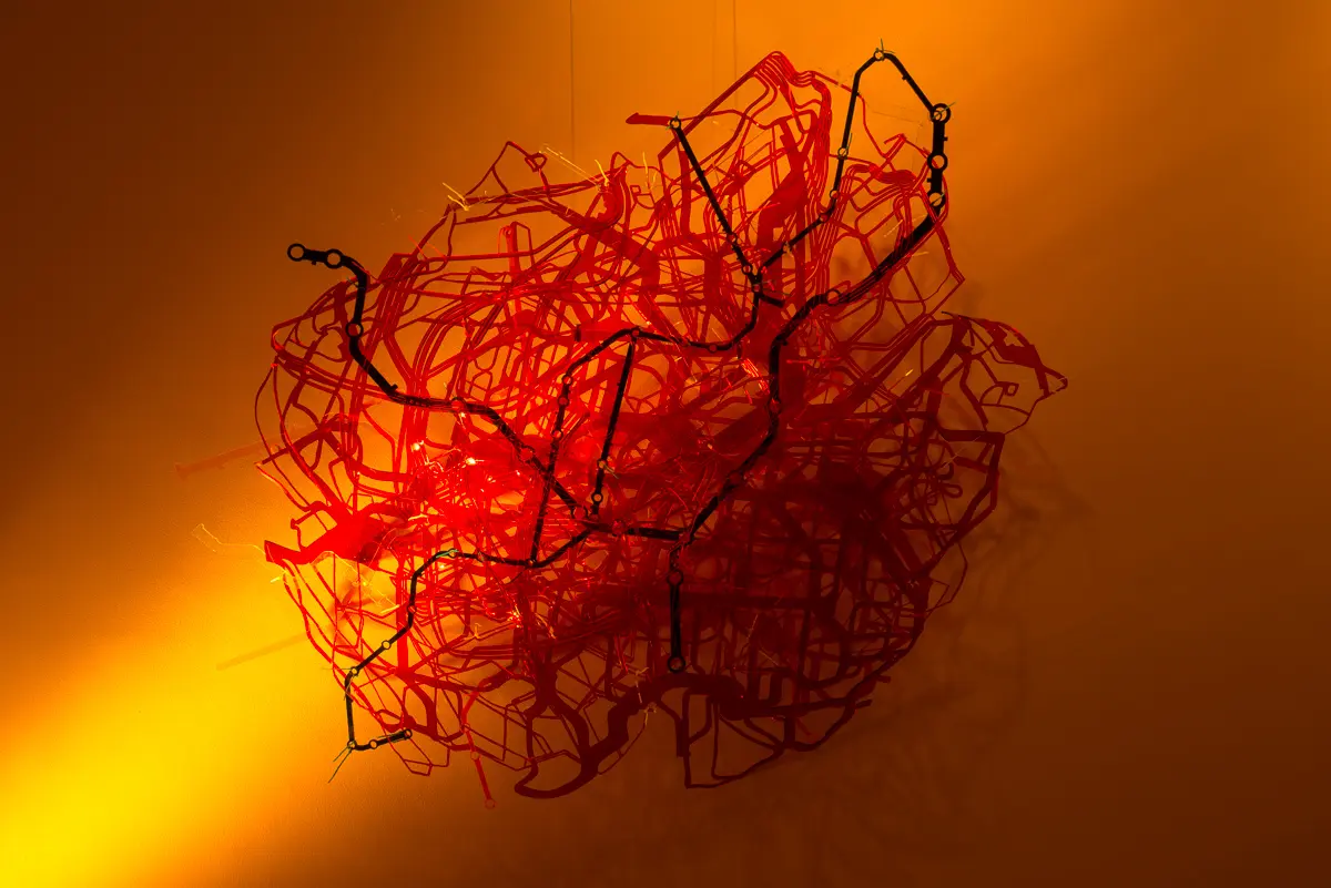 Lisa Jones: merges the aesthetics of invisible cities with fragmented bodies, secret networks and artistic algorithms. The aim is to enliven these incongruities with traces of lived experience and layered spaces. Incompatible ideas merge and are revealed through both order and chaos, appearing as single multi-layered works. Her works are spatial explorations. in two- and three-dimensions in a wide range of materials including ink, paint, stencils, pencil, laser-cut acrylic and laser-cut and burnt paper. http://www.lisajones.net/