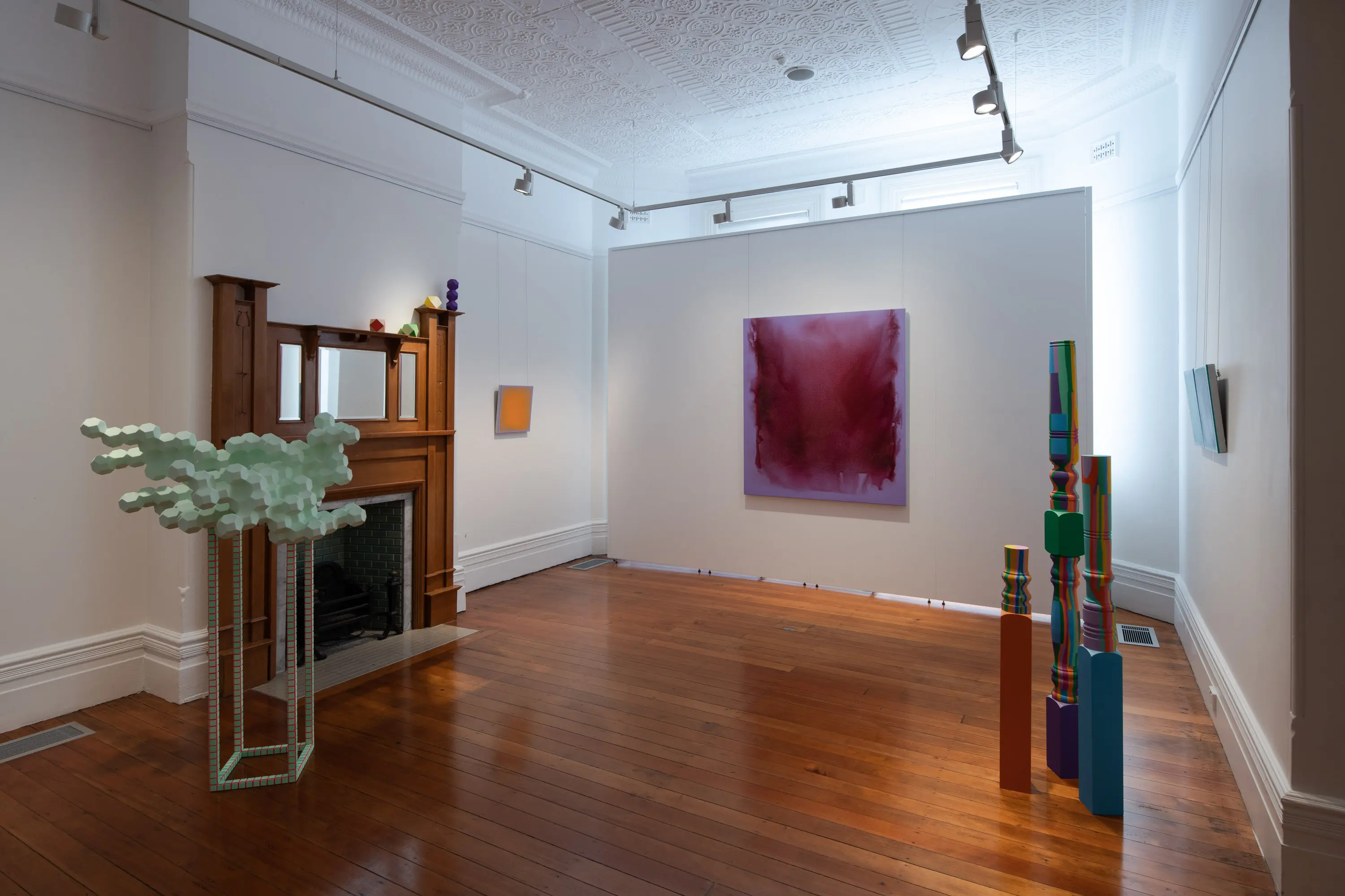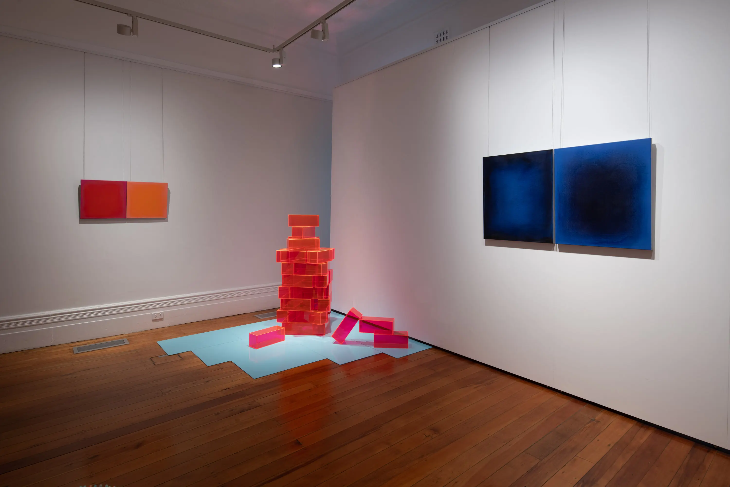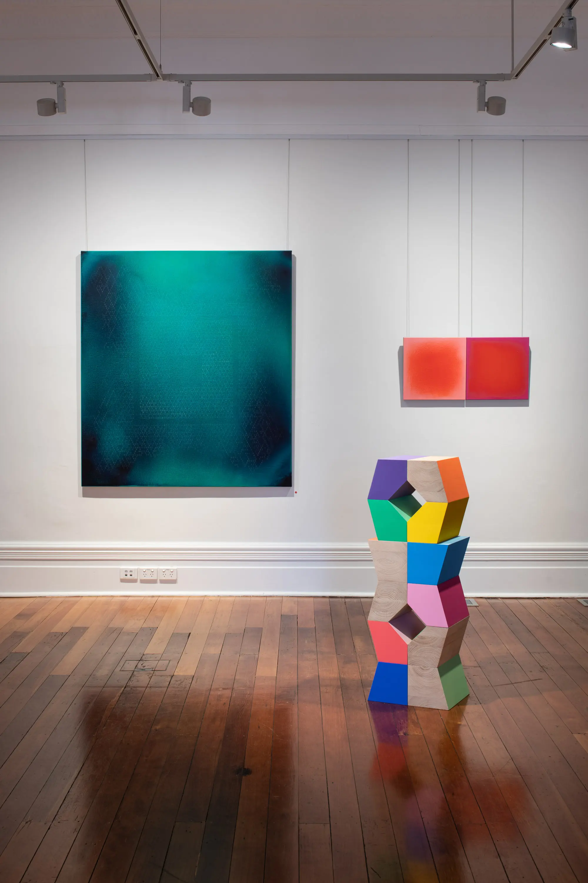 In this exhibition, these artists play with syntax and colour relationships that have evolved through considered juxtaposition, serendipity and play. While most works are authored individually, the installation is the result of many sessions of prior collaborative investigation. The architectural embellishments of the gallery’s four exhibition spaces have also played into this collaboration, and reveal surprising relationships between colour and form, as they also consider the material /immaterial porous boundaries within this exhibition.