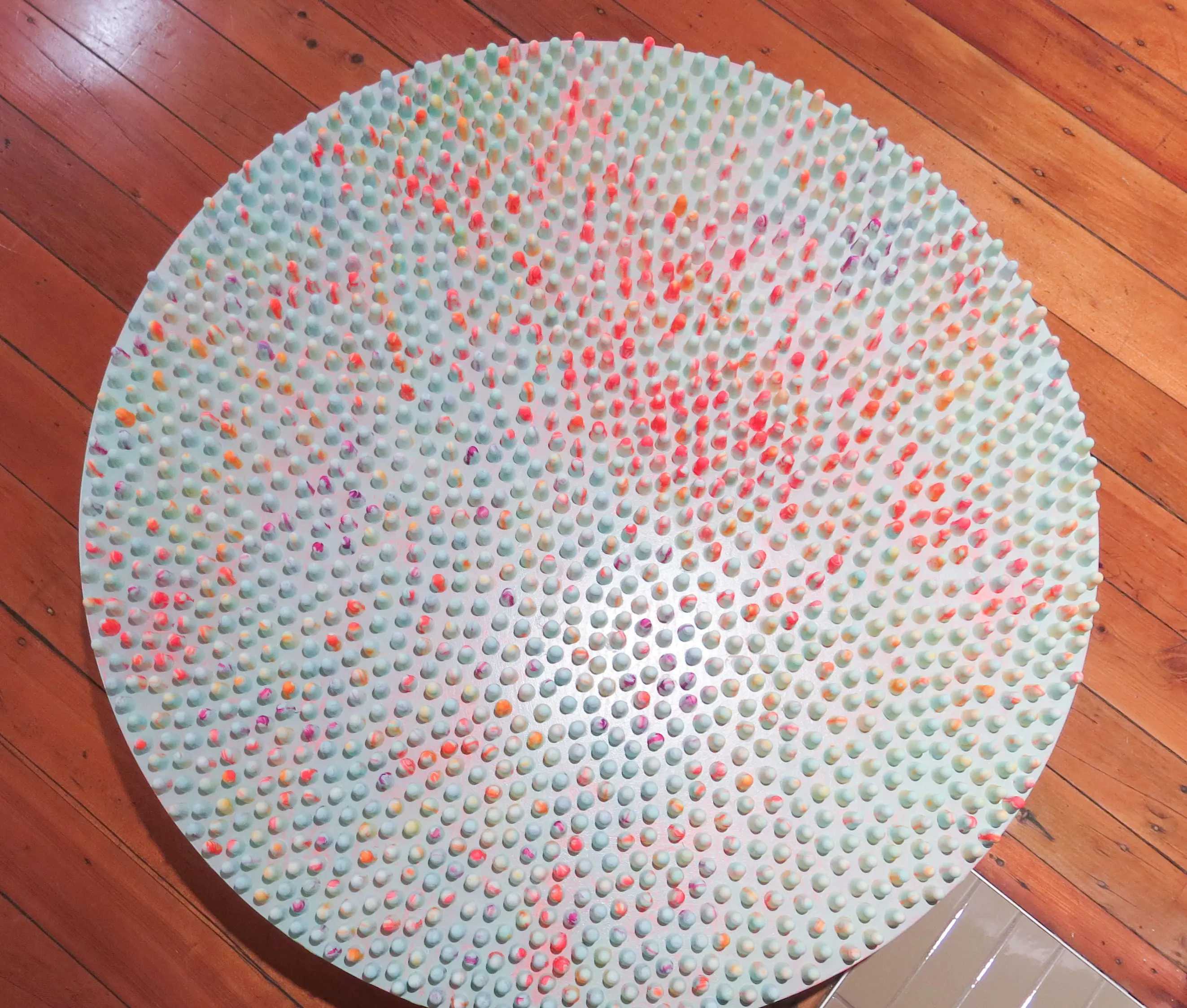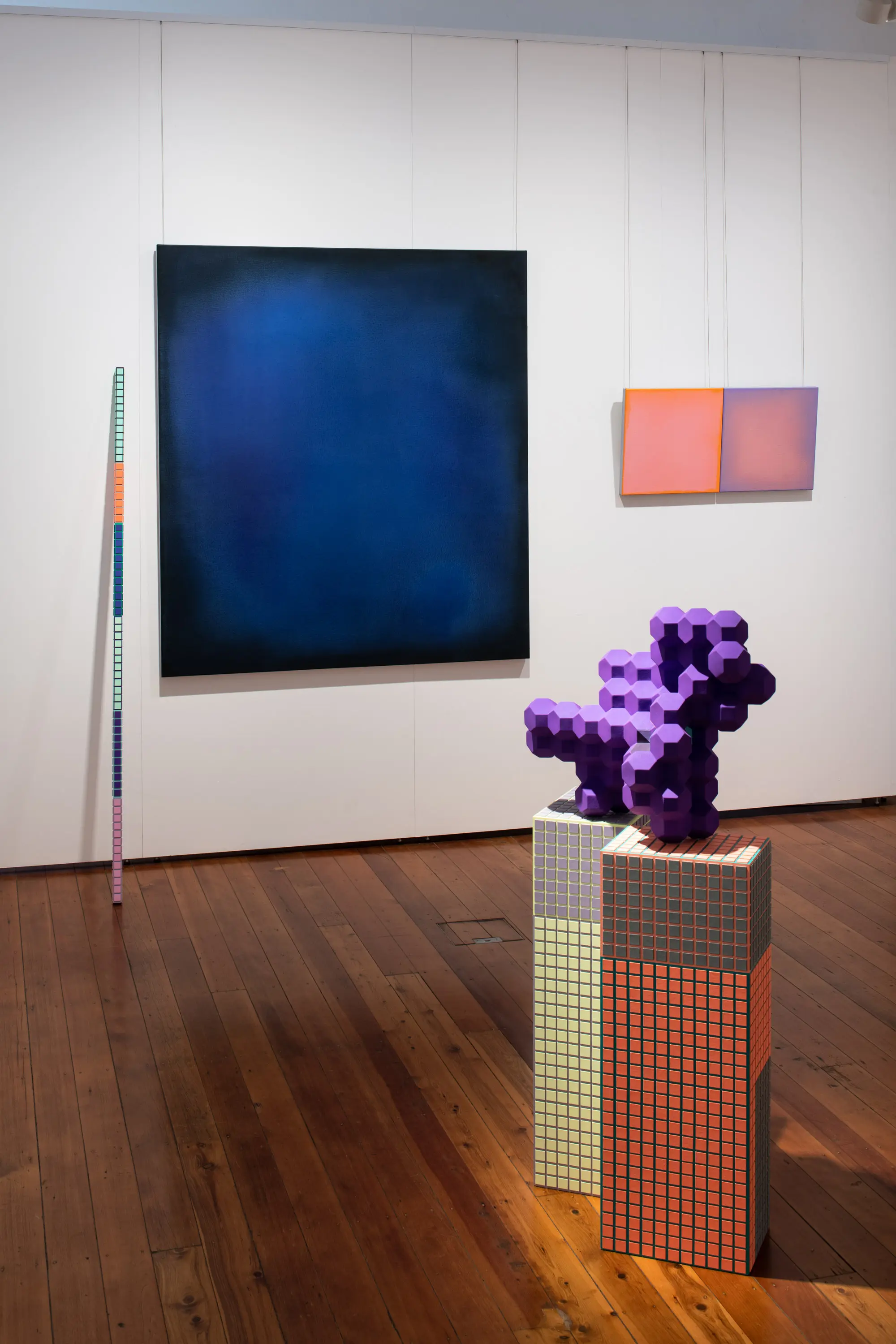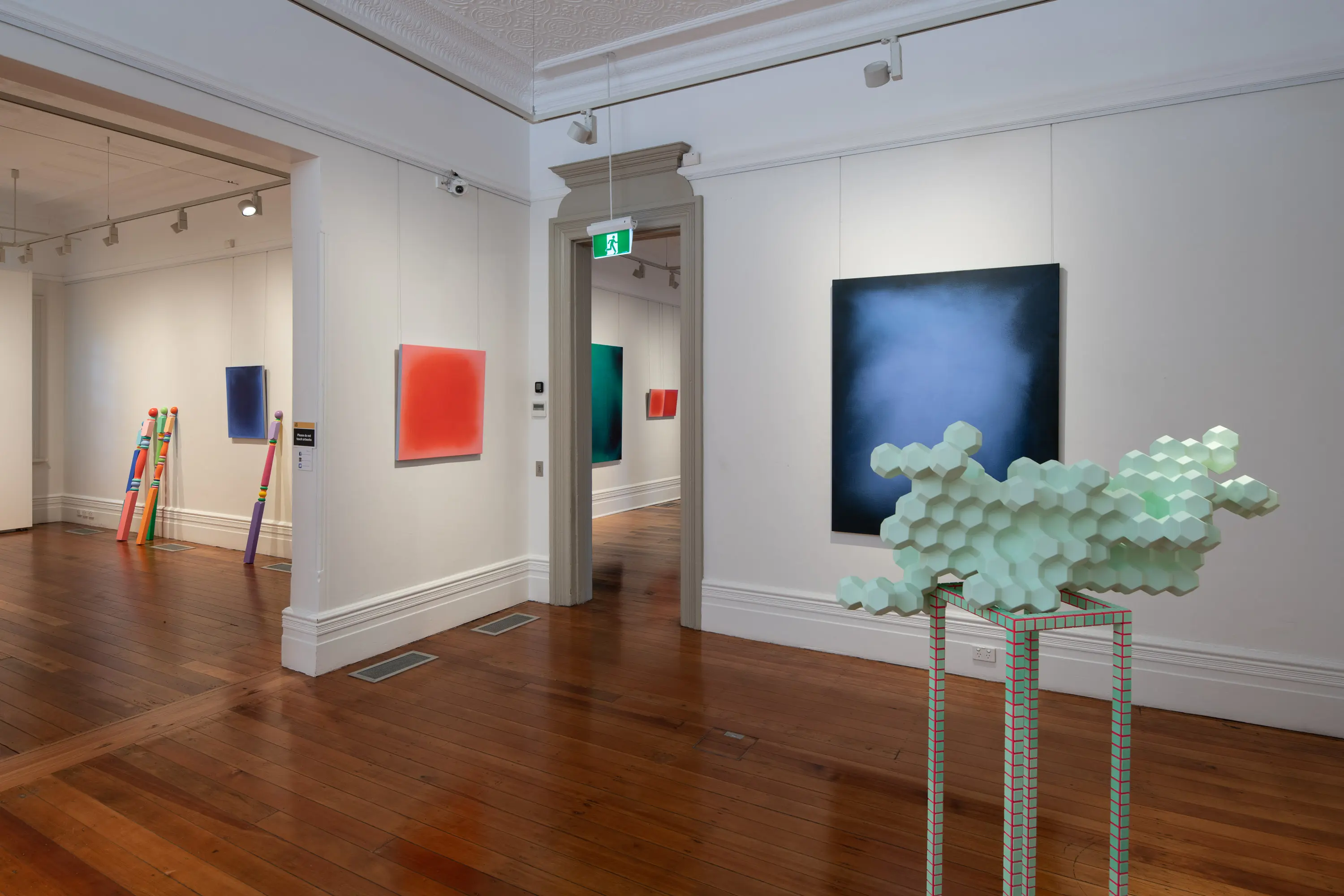 In this exhibition, these artists play with syntax and colour relationships that have evolved through considered juxtaposition, serendipity and play. While most works are authored individually, the installation is the result of many sessions of prior collaborative investigation. The architectural embellishments of the gallery’s four exhibition spaces have also played into this collaboration, and reveal surprising relationships between colour and form, as they also consider the material /immaterial porous boundaries within this exhibition.