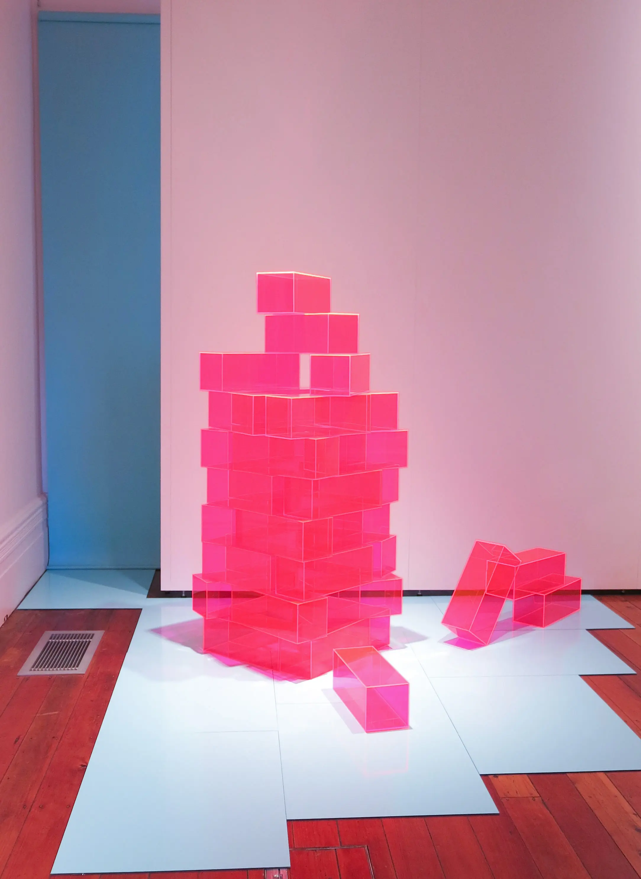 Sherna Teperson’s practice has been described as a poetics of materials. Through a process of play and crafted material labour, she uses surface vibration and provocative colour to challenge how artificial illumination and backlit technologies belie our expectations of material pigment.